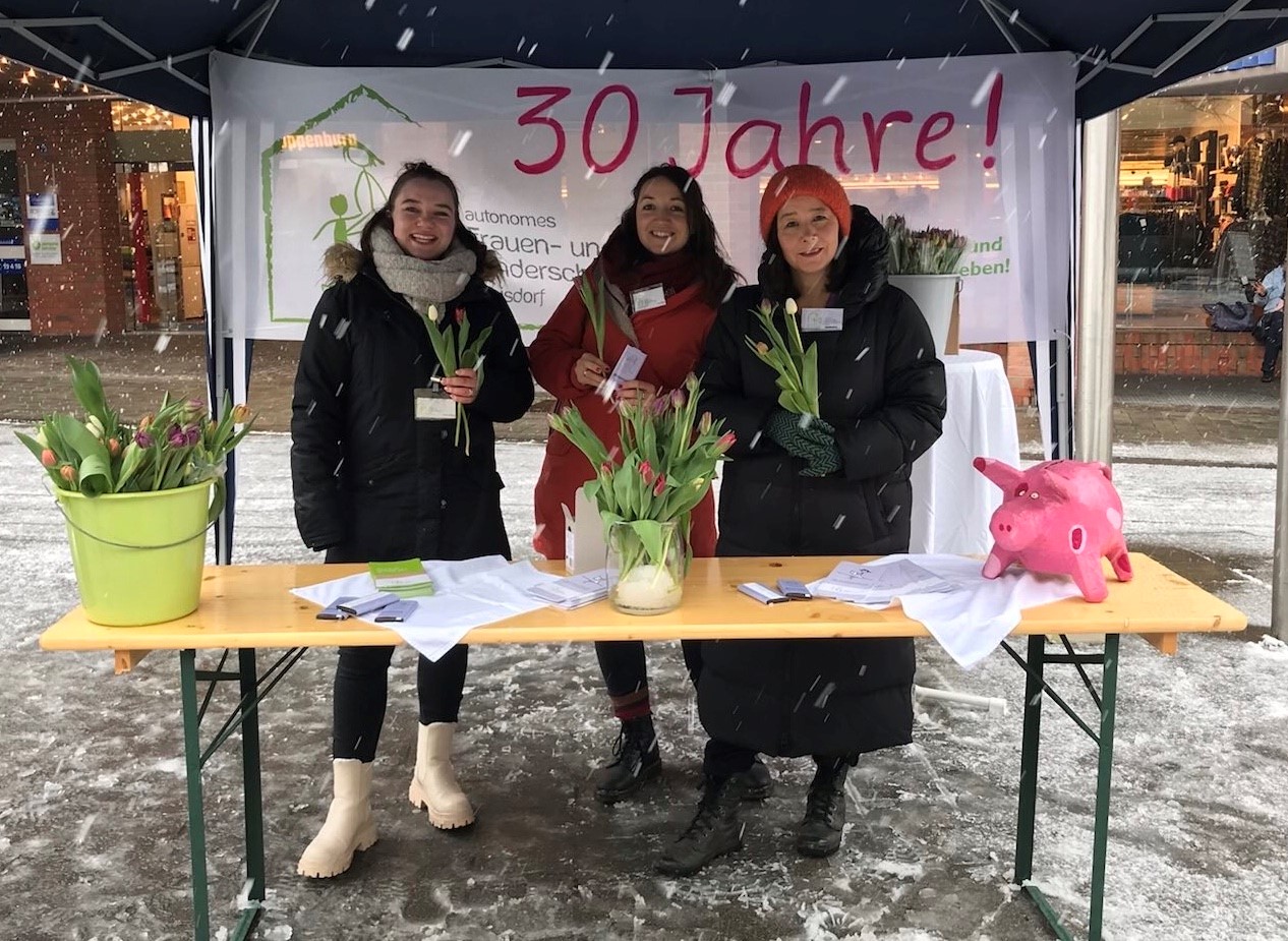 In diesem Jahr ist Frauen helfen Frauen Troisdorf e.V. 30 Jahre alt geworden. Wir haben zum Weltfrauentag am 8. März im Schneegestöber mit bittersüßer Schokolade und Tulpen auf den erheblichen Bedarf an mehr Schutzplätzen für den Rhein-Sieg-Kreis hingewiesen.