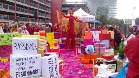 Am 11.September haben wir vor dem Landtag in Düsseldorf für ein Landesfinanzierungsgesetz demonstriert. Dieses soll eine verlässliche und bedarfsgerechte Finanzierung der Frauenhäuser ermöglichen und eine Förderung aus einer Hand ermöglichen. Das steht so im Koalitionsvertrag. Bisher wurde lediglich die vierte Stelle wieder eingeführt, aber nicht voll finanziert. Mittlerweile beläuft sich die Förderung durch das Land auf unter 70% der Personalkosten (es waren einmal 83%). Den Rest und die Sach- und Betriebskoste verhandeln wir mit dem Rhein-Sieg-Kreis. Der fördert uns aber auch nur zu einem Teil. Die Folge für die Frauen sind steigende Tagessätze. Das bedeutet bei uns zahlt eine Frau mit Einkommen (das kann auch nur Unterhaltsvorschuss, Rente oder Unterhaltszahlung sein), eine Schülerin/Studentin (sie steht dem Arbeitsmarkt nicht zu Verfügung und kann kein ALG II beziehen) oder eine Frau mit Duldung 6,03 € pro Person und Tag(für einen Monat sind das für eine Frau mit zwei Kindern 542,70€ und das bei laufenden Mietzahlungen). In anderen Frauenhäusern geht der Tagessatz bis 68,- hoch, weil die Kommune nicht mitfinanziert. Wir fordern eine einheitliche gesicherte Finanzierung für ganz NRW. Es darf keine Rolle spielen, in welcher Region die Frau Schutz sucht.